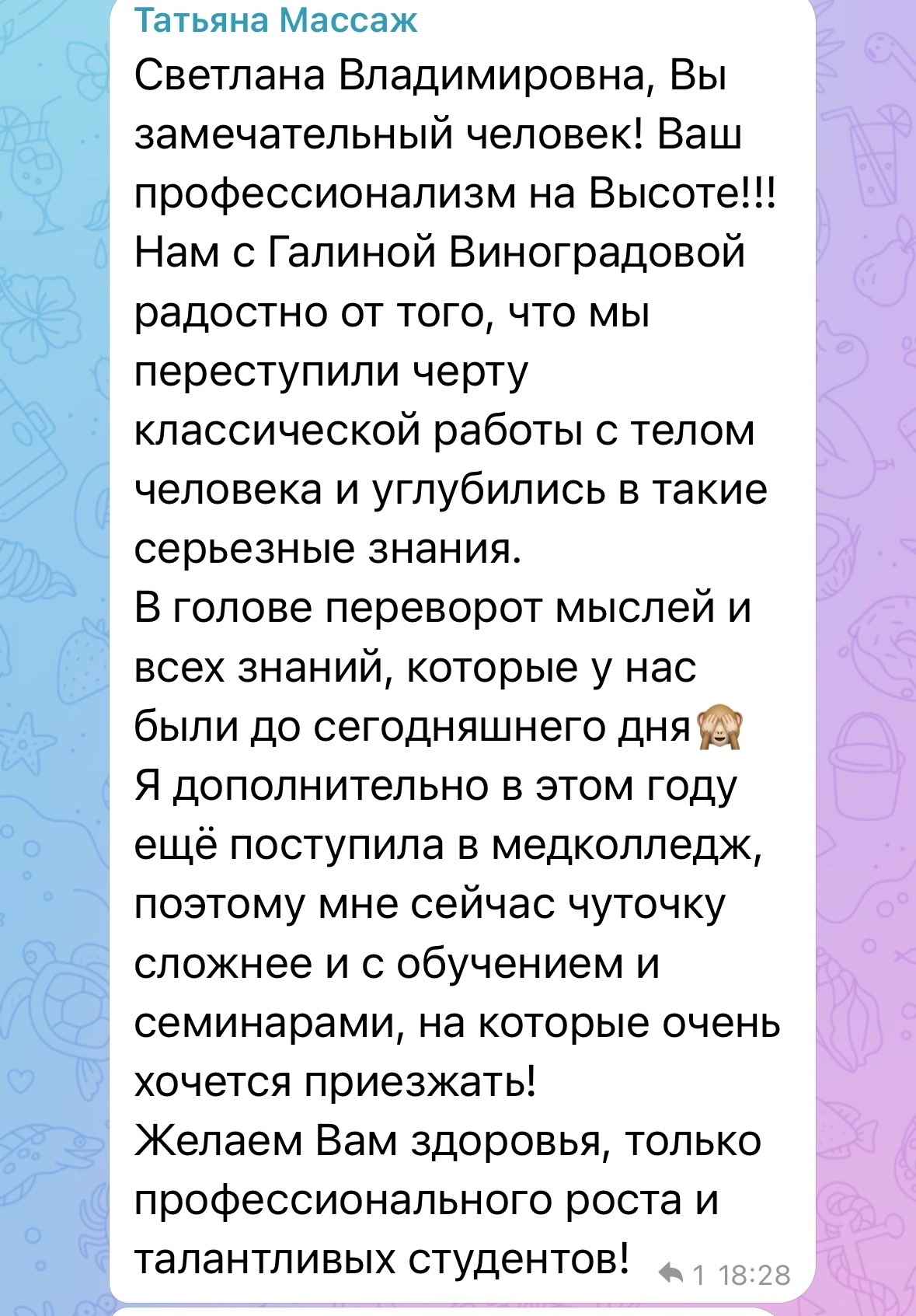 Вы не останетесь наедине с трудностями, ученики вступают в уютное комьюнити — закрытый бессрочный чат в Телеграме, где преподаватель отвечает на вопросы учеников, выпускники академии делятся интересными случаями, результатами работы